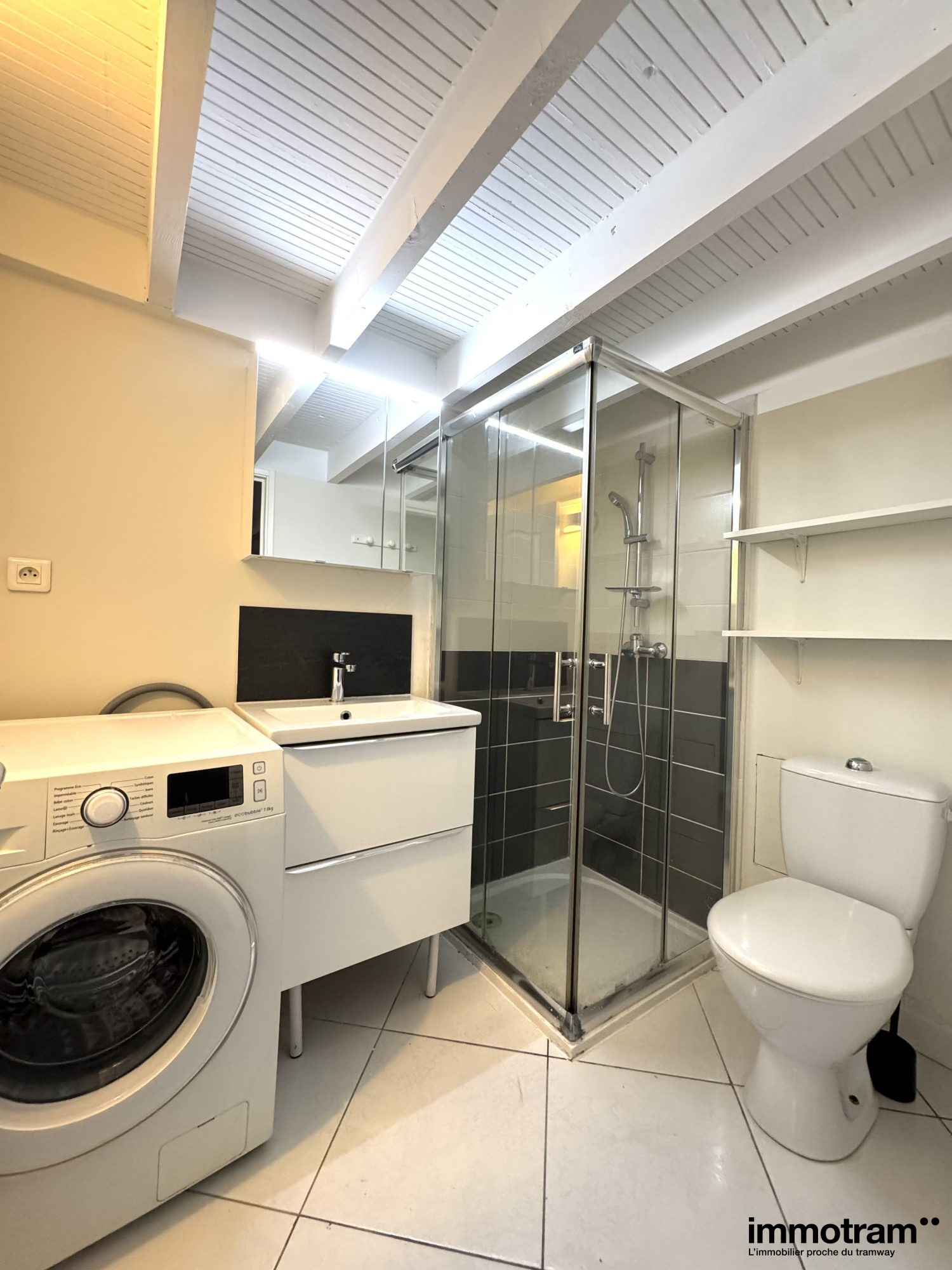 Il se compose d'un espace de vie lumineux, d'une cuisine équipée ouverte, coin chambre en mezzanine et salle de douches équipée (wc, douche, vasque, machine à laver)